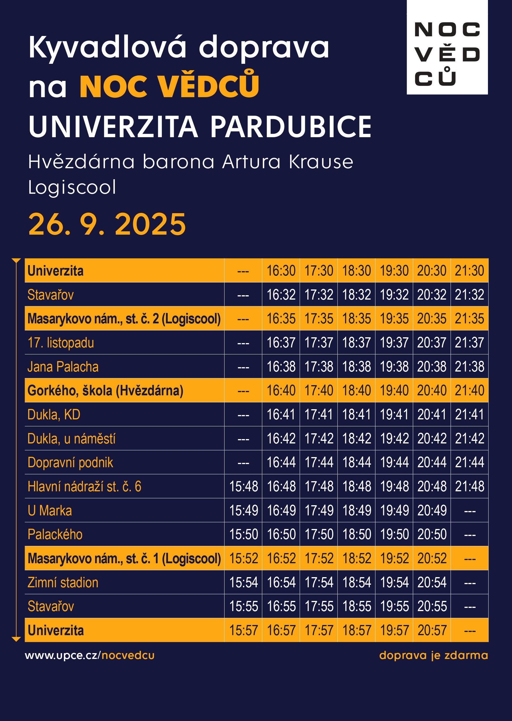 Svezte se na Noc vědců Univerzity Pardubice speciálně vypravenou autobusovou linkou, pohodlně a zdarma. Autobus bude viditelně označen.