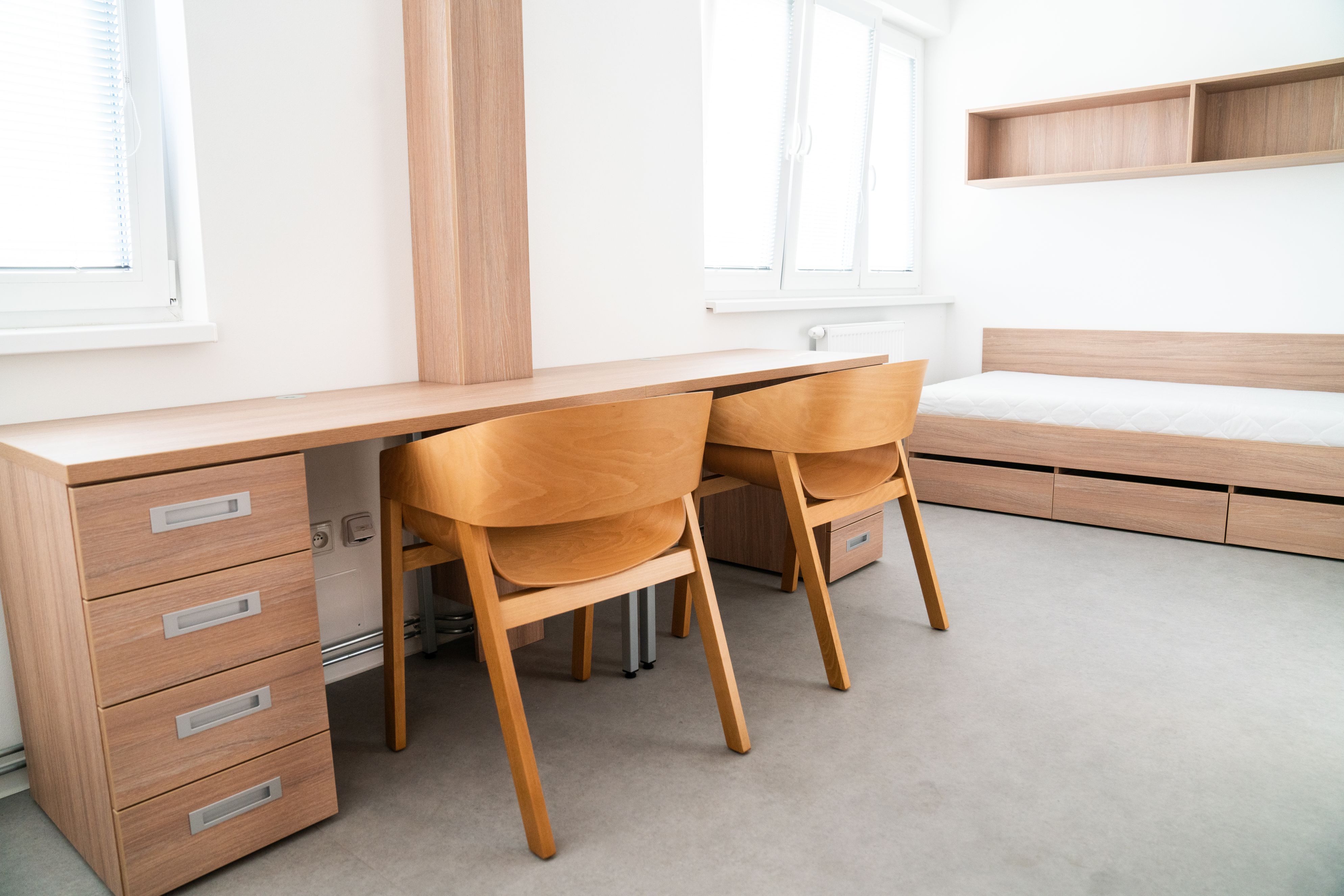Individual room equipment: bed + bedding + bedlinen, desk + chair, wardrobe, shelf, window blinds, waste bin, brush and dustpan.