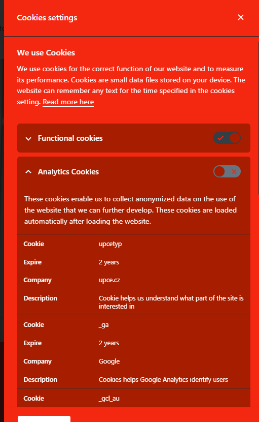 - Analytical cookies – these cookies enable us to collect anonymized data on the use of the website that we can further develop. These cookies are loaded automatically after loading the website. You can unsubscribe from monitoring by clicking on Block in the cookies bar.