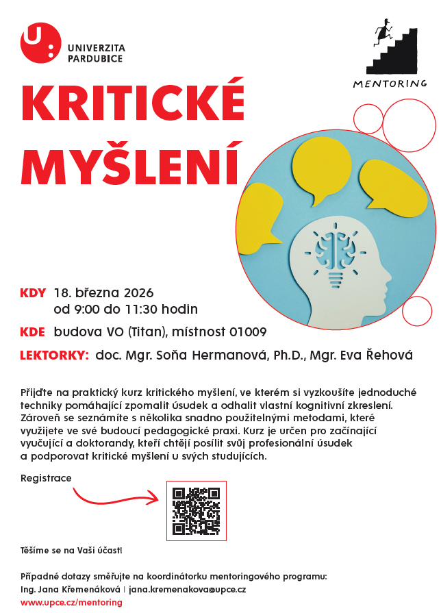 Přijďte na praktický kurz kritického myšlení, ve kterém si vyzkoušíte jednoduché techniky pomáhající zpomalit úsudek a odhalit vlastní kognitivní zkreslení. Zároveň se seznámíte s několika snadno použitelnými metodami, které využijete ve své budoucí pedagogické praxi. Kurz je určen pro začínající vyučující a doktorandy, kteří chtějí posílit svůj profesionální úsudek a podporovat kritické myšlení u svých studujících.