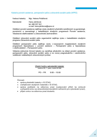 10Katedra porodn%u00ed asistence, periopera%u010dn%u00ed p%u00e9%u010de a zdravotn%u011b-soci%u00e1ln%u00ed p%u00e9%u010de (KPPZ)Vedouc%u00edkatedry:Mgr. Helena Pol%u00e1%u010dkov%u00e1Sekretari%u00e1t:Hana Jel%u00ednkov%u00e1tel: 466037541e-mail: hana.jelinkova@upce.czOdd%u011blen%u00ed porodn%u00ed asistence zaji%u0161%u0165uje v%u00fduku studijn%u00edch p%u0159edm%u011bt%u016f zam%u011b%u0159en%u00fdch na gynekologii, porodnictv%u00ed a neonatologii v bakal%u00e1%u0159sk%u00fdch studijn%u00edch programech Porodn%u00ed asistence, V%u0161eobecn%u00e9 o%u0161et%u0159ovatelstv%u00eda Zdravotnick%u00e9 z%u00e1chran%u00e1%u0159stv%u00ed.Odd%u011blen%u00ed zdravotn%u011b soci%u00e1ln%u00ed p%u00e9%u010de organiza%u010dn%u011b zaji%u0161%u0165uje v%u00fduku v bakal%u00e1%u0159sk%u00e9m studijn%u00edm programu Zdravotn%u011b soci%u00e1ln%u00ed p%u00e9%u010de.Odd%u011blen%u00ed periopera%u010dn%u00ed p%u00e9%u010de zaji%u0161%u0165uje v%u00fduku vnavazuj%u00edc%u00edchmagistersk%u00fdchstudijn%u00edchprogramechSpecializace v porodn%u00ed asistenci %u2013Periopera%u010dn%u00ed p%u00e9%u010de a Specializace vo%u0161et%u0159ovatelstv%u00ed Periopera%u010dn%u00ed p%u00e9%u010de.V%u011bdecko-v%u00fdzkumn%u00e1 %u010dinnost katedry se zam%u011b%u0159uje p%u0159edev%u0161%u00edm na oblast porodn%u00ed asistence, periopera%u010dn%u00ed p%u00e9%u010de, zdravotn%u011b soci%u00e1ln%u00ed p%u00e9%u010de a na rozvoj pregradu%u00e1ln%u00edho i celo%u017eivotn%u00edho vzd%u011bl%u00e1v%u00e1n%u00ednel%u00e9ka%u0159sk%u00fdch zdravotnick%u00fdch profes%u00ed.%u010cinnosti:%u2022spr%u00e1va p%u0159edm%u011bt%u016f katedry v IS STAG,%u2022zve%u0159ej%u0148ov%u00e1n%u00ed studijn%u00edch materi%u00e1l%u016f v IS STAG,%u2022spr%u00e1va podklad%u016f na odbornou praxi (vystavov%u00e1n%u00ed p%u0159%u00edloh ke smlouv%u011b a p%u0159%u00edpadn%u011b smluv se zdravotnick%u00fdm/soci%u00e1ln%u00edm za%u0159%u00edzen%u00edm pro vykon%u00e1v%u00e1n%u00ed prax%u00ed),%u2022p%u0159%u00edjem smluv na odbornou praxi student%u016f.%u00da%u0159edn%u00edhodinysekretari%u00e1t%u016fkatederbudova ZD, 1. patro, dve%u0159e02008PO %u2013P%u00c19:00%u201315:00