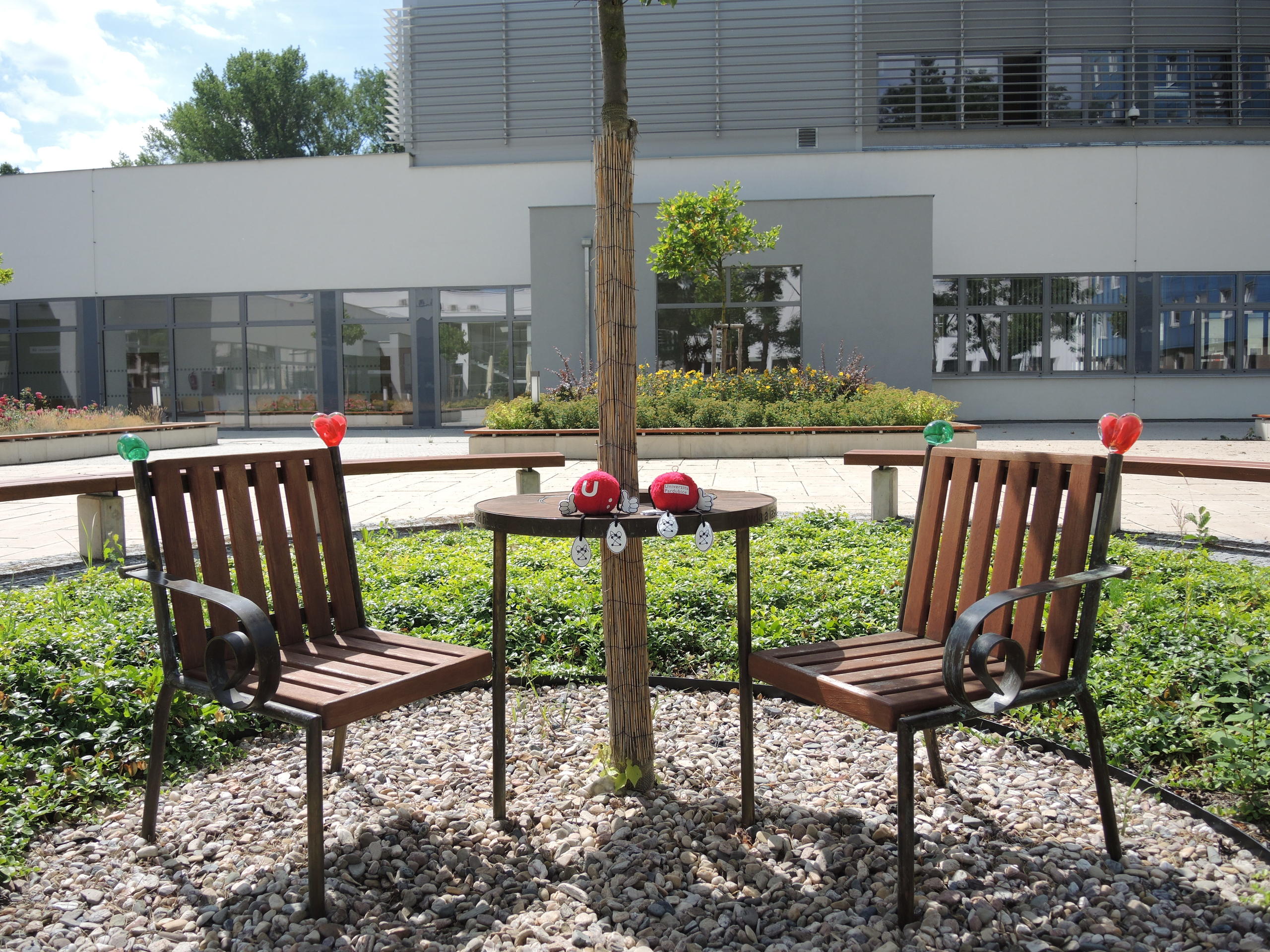 Dvě křesla spojená kulatým dřevěným stolem, na jehož kovové obrubě je vyryto motto: „Pravda a láska musí zvítězit nad lží a nenávistí“ a jehož středem prorůstá lípa. V horní části opěrky křesel jsou umístěné skleněné červené srdce a zelený šnek.