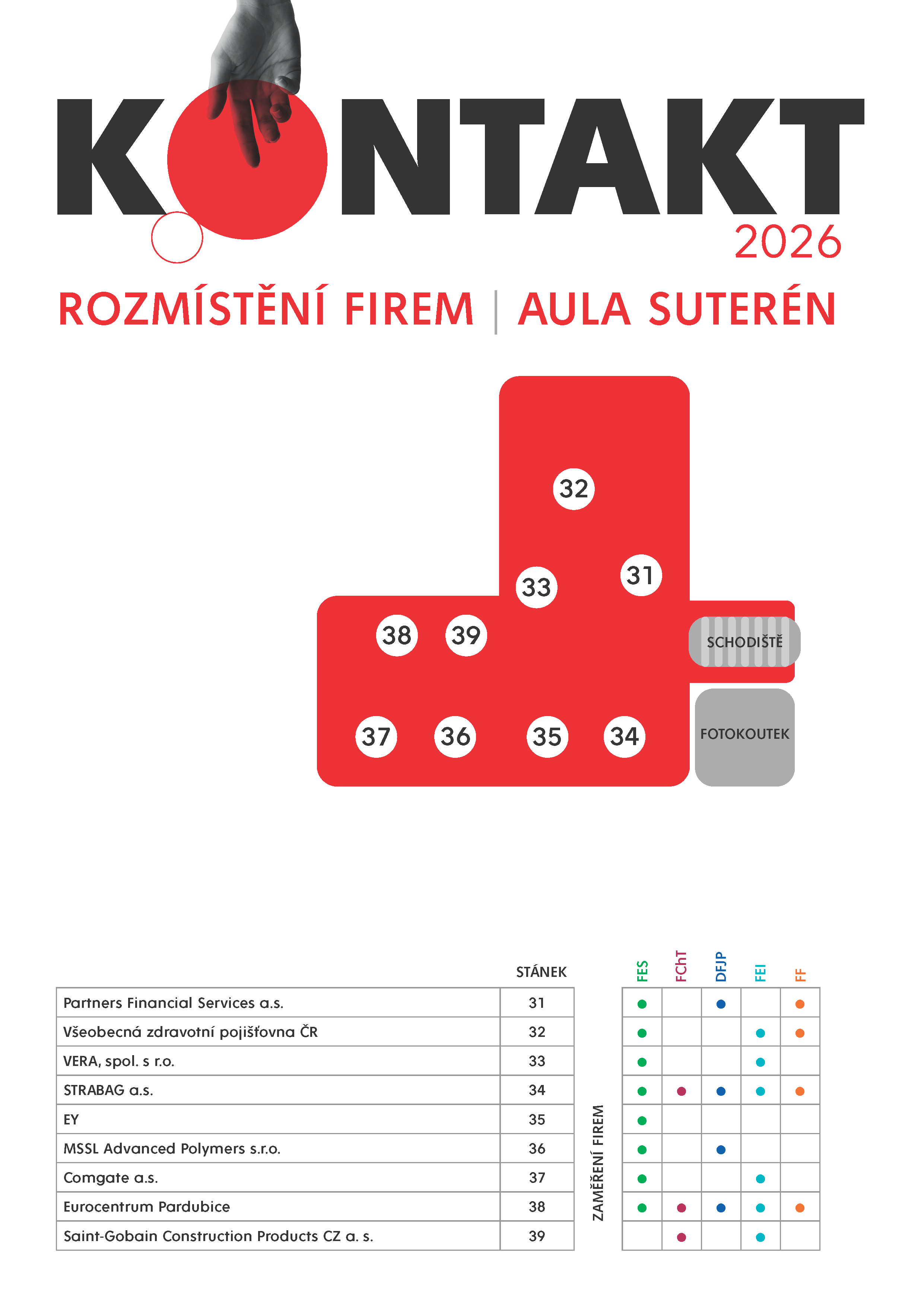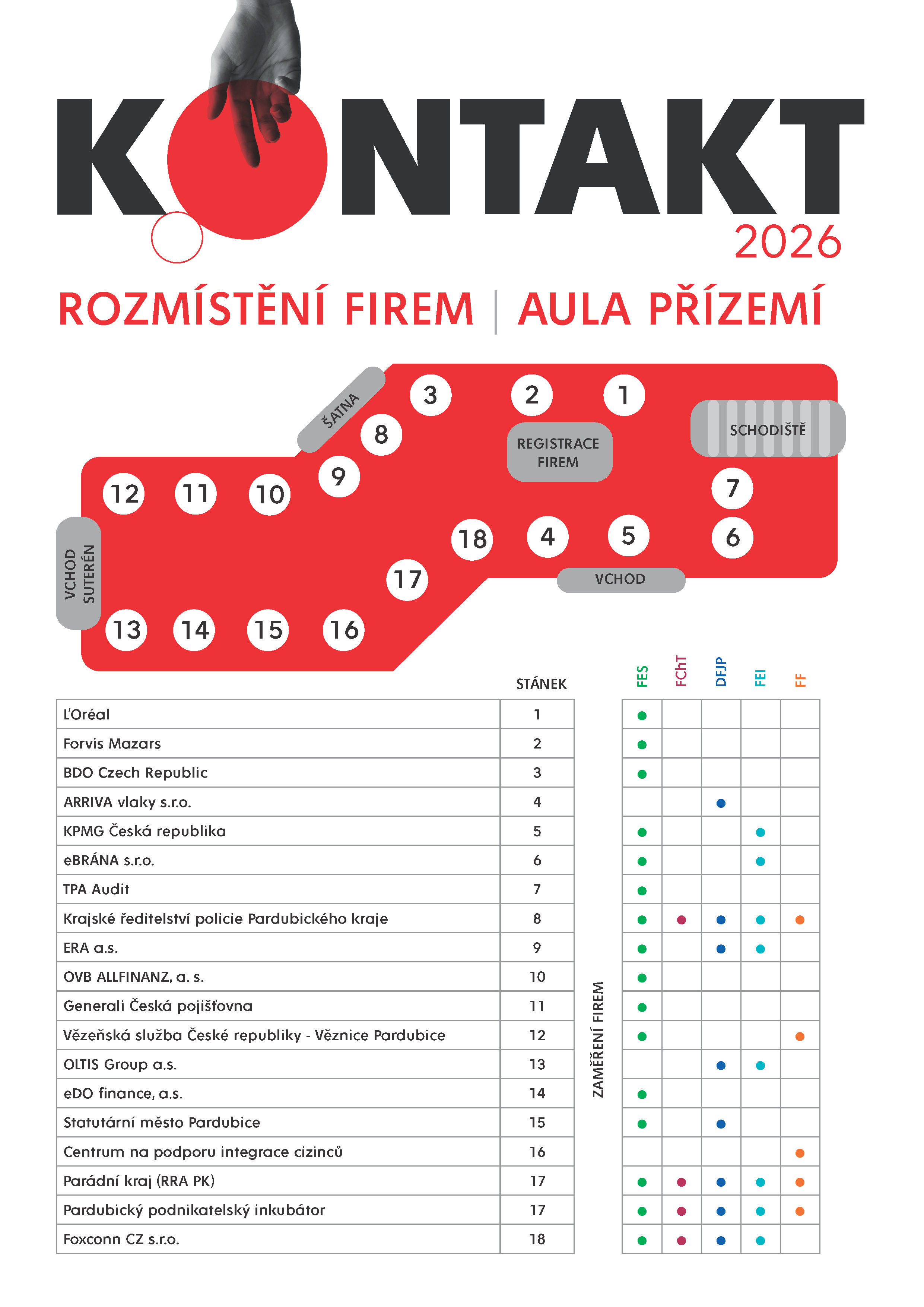 KONTAKT 2026 je veletrh pracovních příležitostí pro studenty a absolventy Univerzity Pardubice. Je založen na osobním kontaktu mezi studenty a zástupci firem a odehrává se přímo v prostorách Univerzity Pardubice. KONTAKT 2026 nabízí studentům aktuální pracovní pozice, stáže a brigády, konzultace životopisů, pohovory nanečisto i různé soutěže.