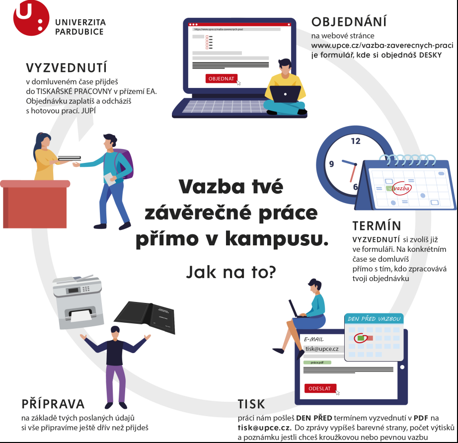 Práci nám posílejte minimálně 24 hodin (pouze pracovní dny) před termínem vyzvednutí vazby ve formátu PDF na tisk@upce.cz.